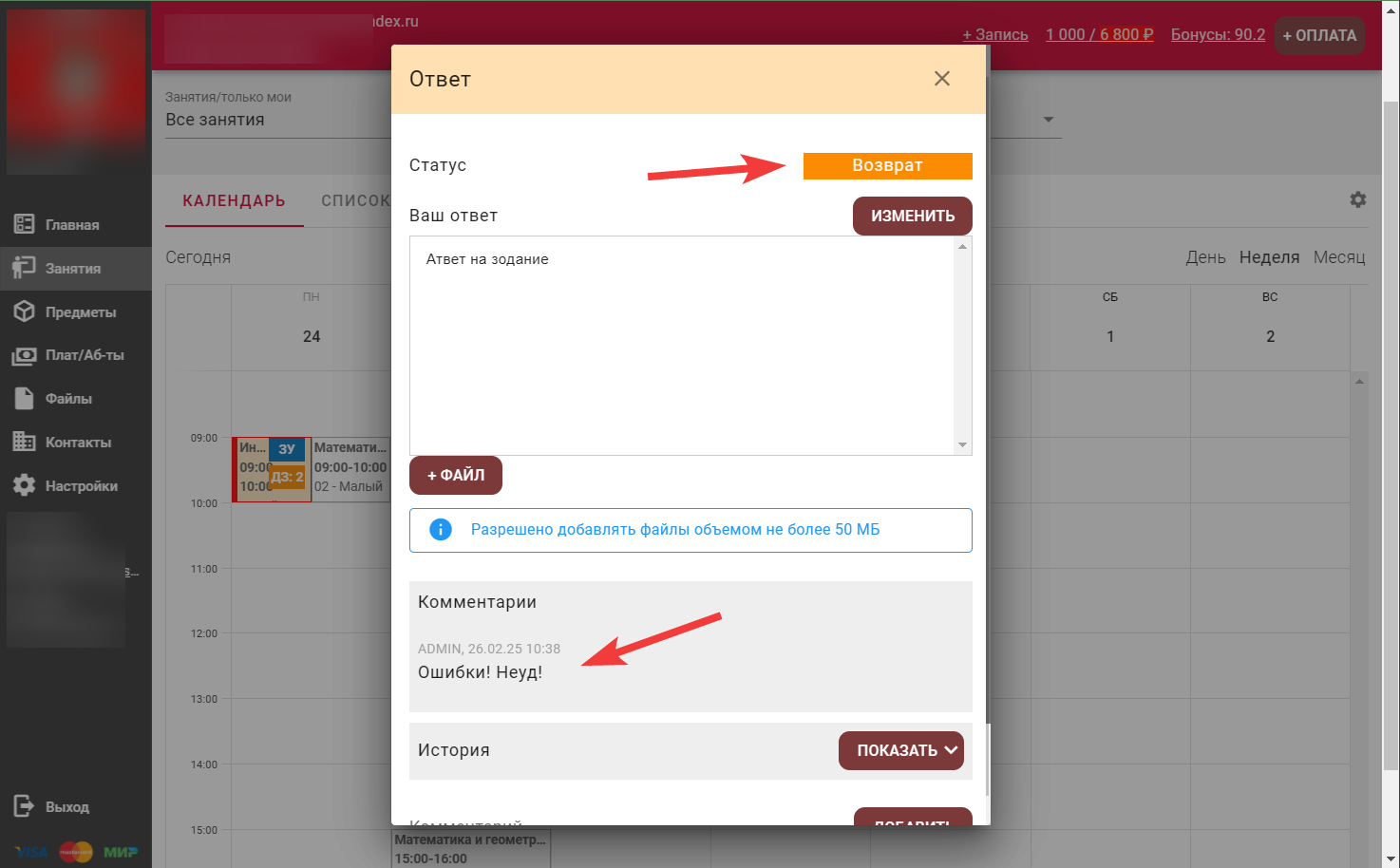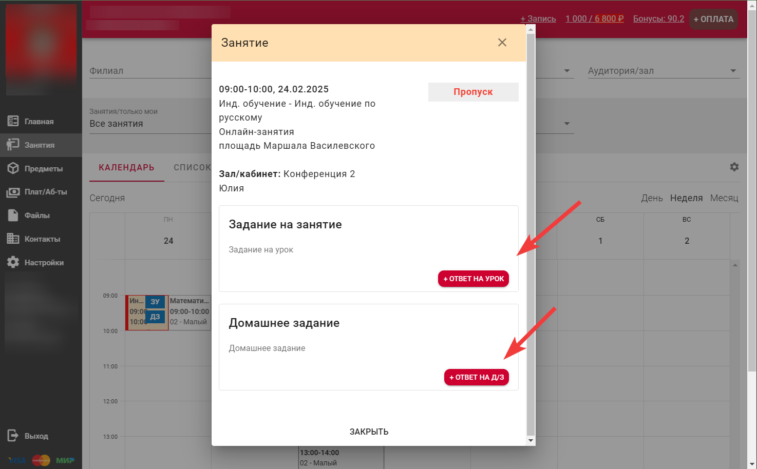 Кликните на ячейку занятия. В открывшемся окне вы увидите содержание заданий и кнопки для ответов - "+ Ответ на урок" и "+ Ответ на Д/З":