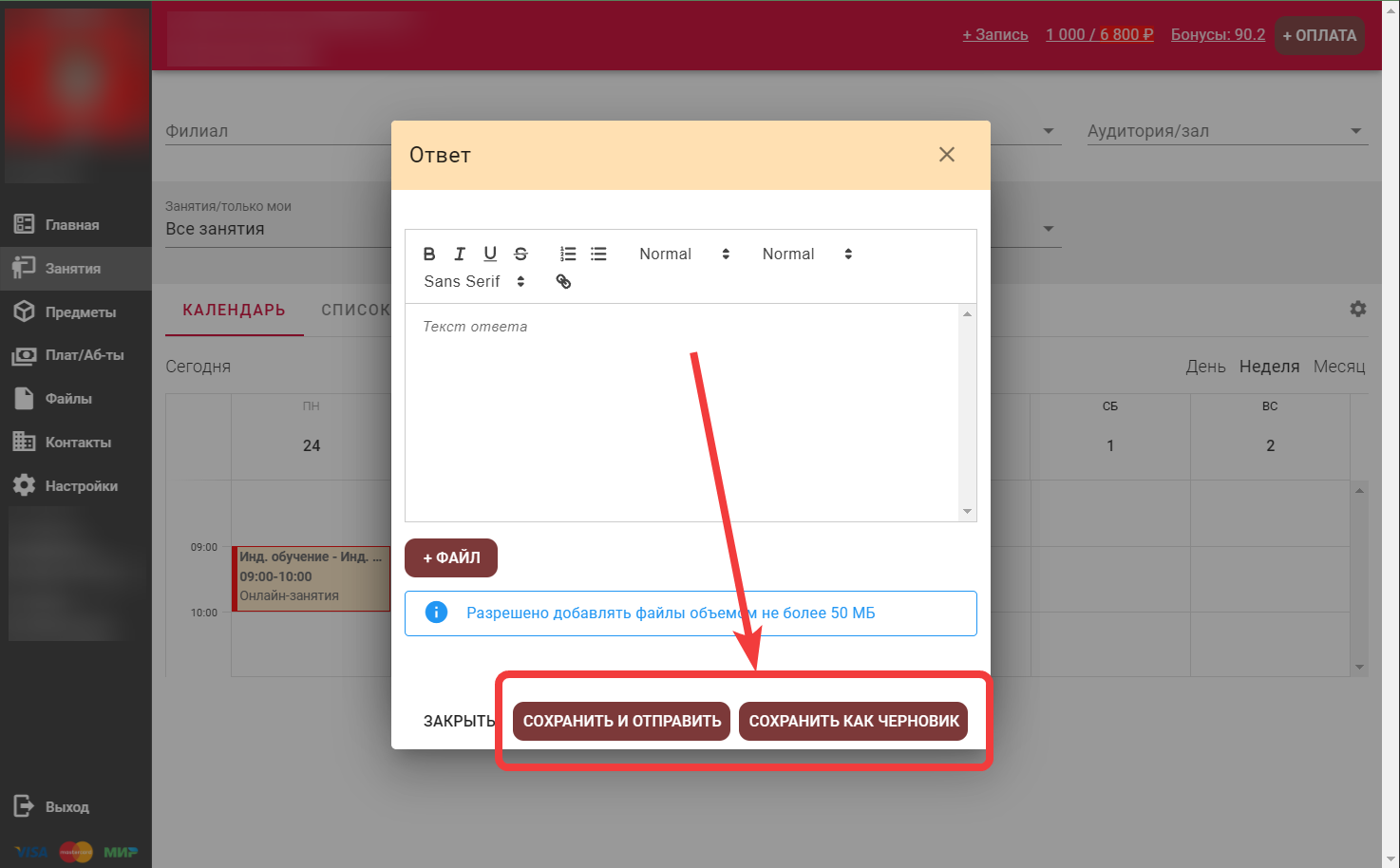 Вы можете написать ответ и сохранить его как черновик или сразу отправить на проверку преподавателю: