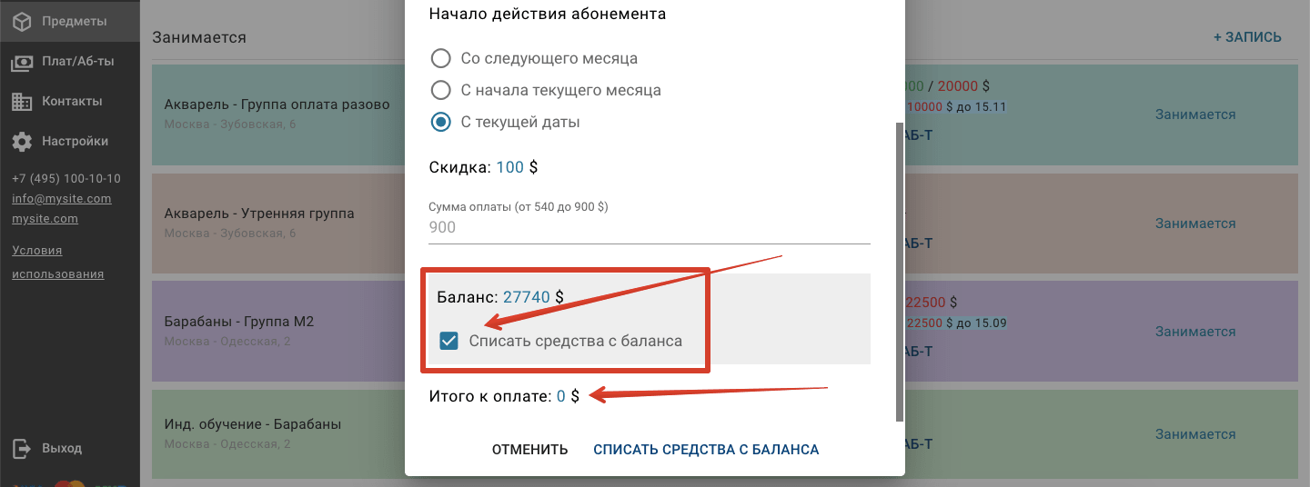 Если у вас есть средства на балансе, вы можете оплатить ими - полностью или частично обучение/абонемент. Для этого поставьте галочку "Списать средства с баланса". Итоговая сумма к оплате будет уменьшена. Если у вас на балансе есть вся сумма, то вносить средства уже не потребуется - деньги просто спишутся с баланса в пользу обучения/абонемента.