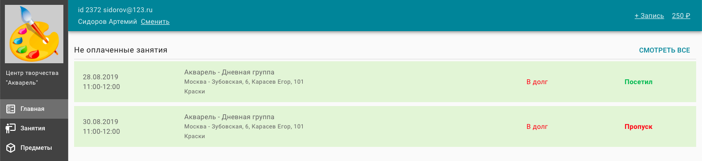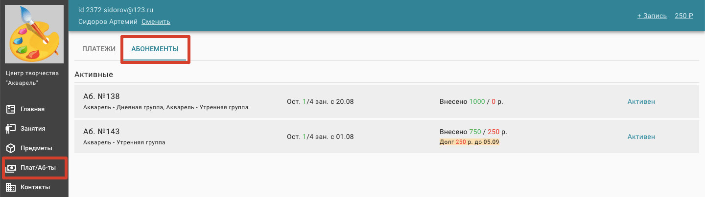 б) группы/предметы - с не оплаченными занятиями, в долг (для групп с оплатой за занятия), и те, за которые оплачено меньше, чем цена записи (для групп с единоразовой оплатой). Например, курс стоит 10000 р., а внесено 5000 р.