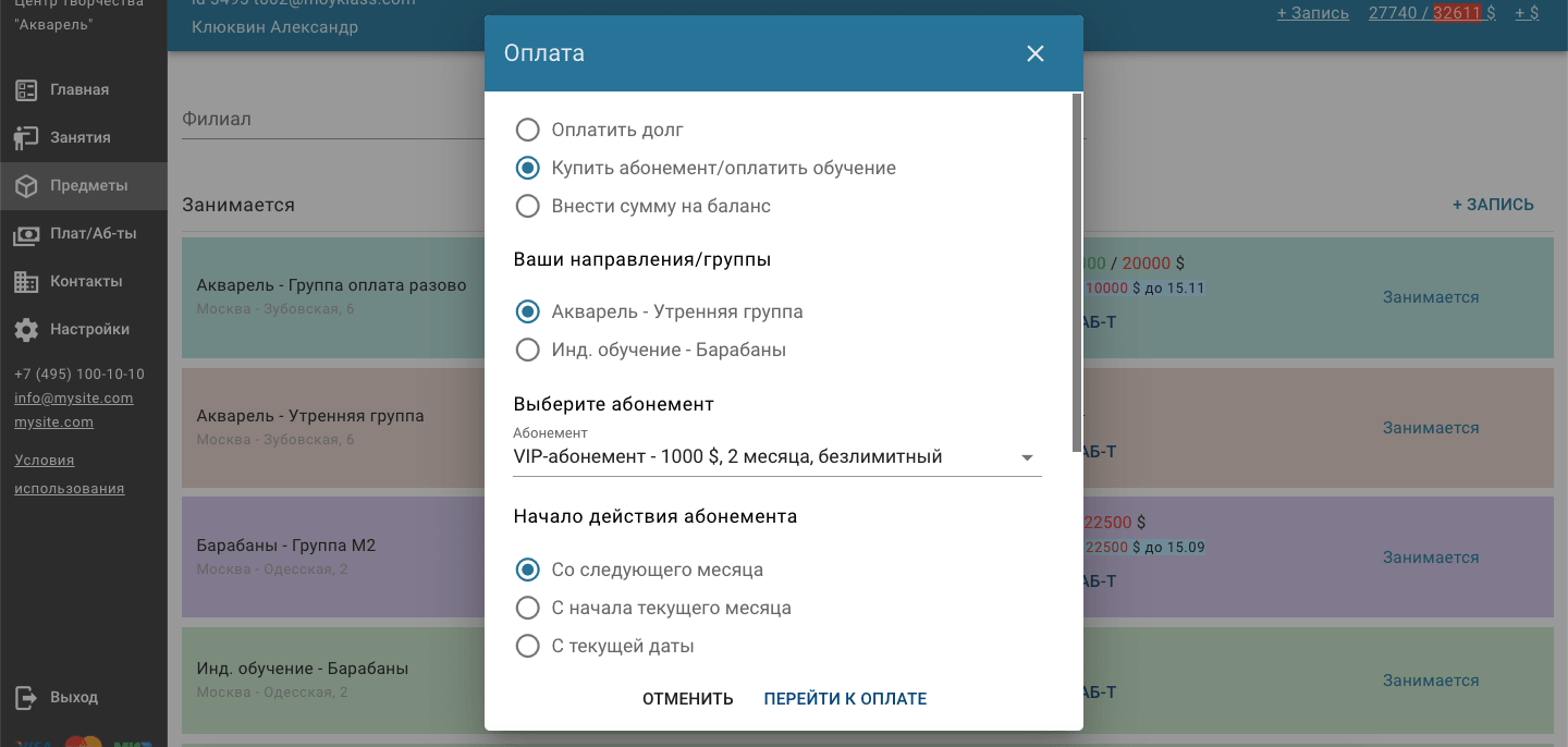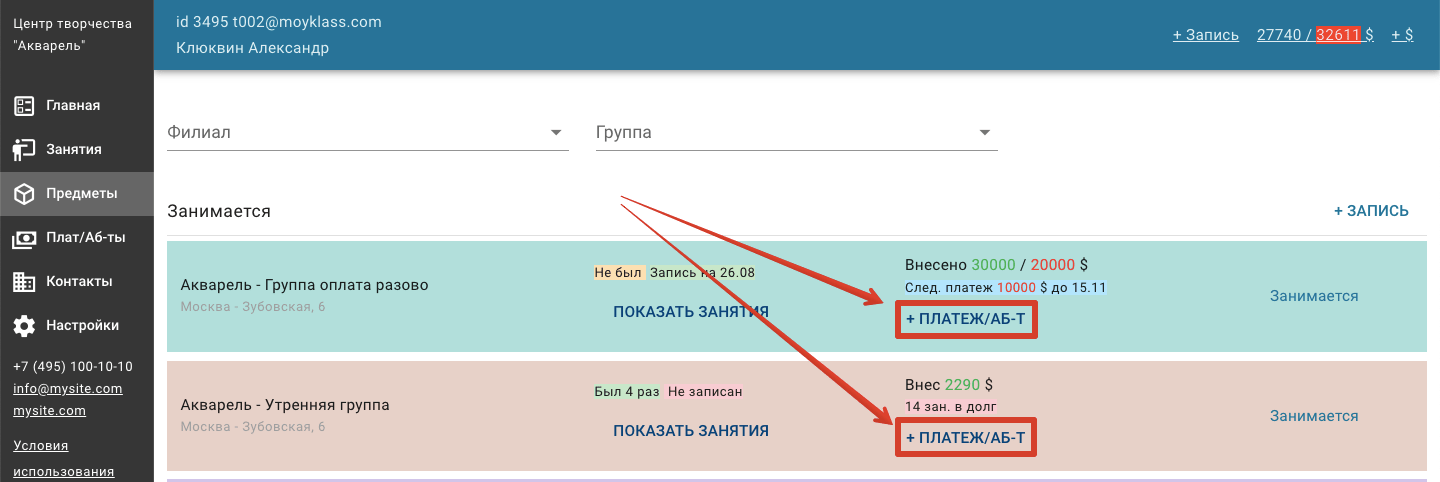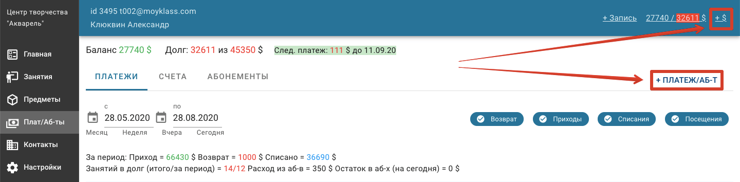 Чтобы совершить оплату, нажмите на значок "+$" сверху в меню или на кнопку "+ Платеж/абонемент" в разделах "Платежи" или "Предметы".