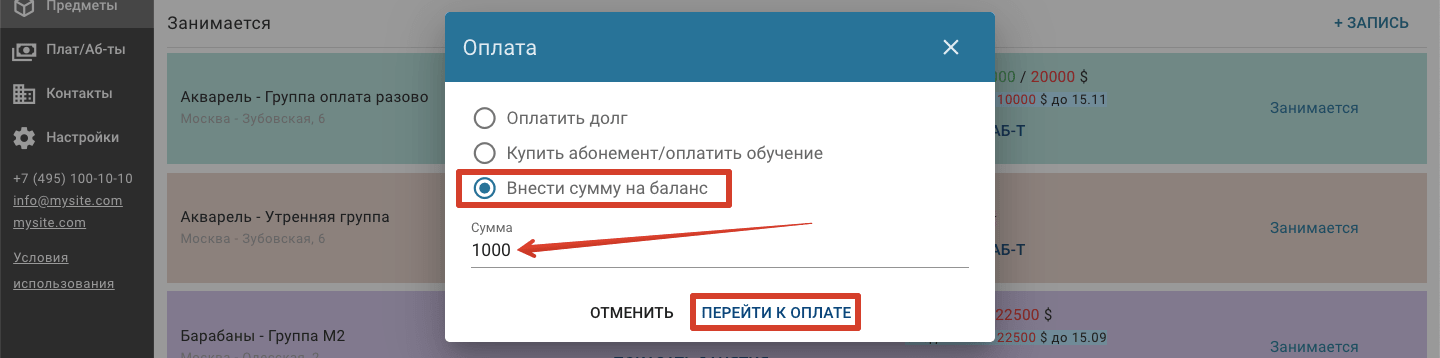 - внести сумму на баланс (затем с баланса ее можно "списать" в пользу обучение или абонемента - т.е. оплатить деньгами с баланса курс/мастер-класс или абонемент).