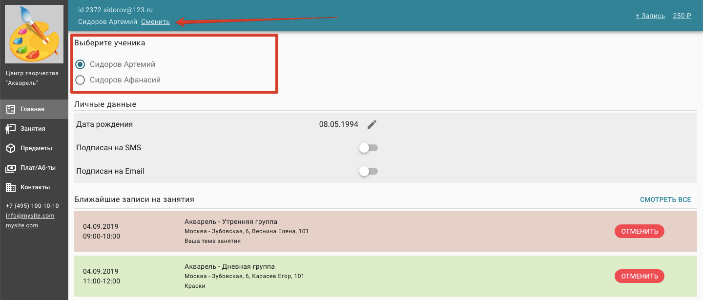 Во втором случае вы можете просто получать информацию по каждому из ваших учеников. После захода в личный кабинет выберите нужного ученика на главной странице или вверху: