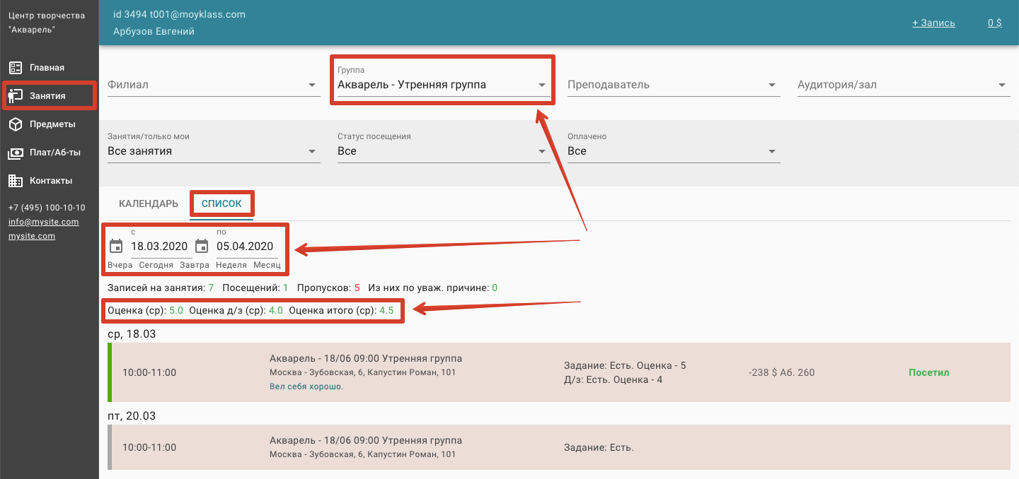 Перейдите в раздел "Занятия", выберите вид "Список". Укажите предмет (группу), по которой они хотят получить данные, при необходимости. Затем задайте период - с даты по дату. Система покажет среднюю оценку по данной группе за выбранный период::