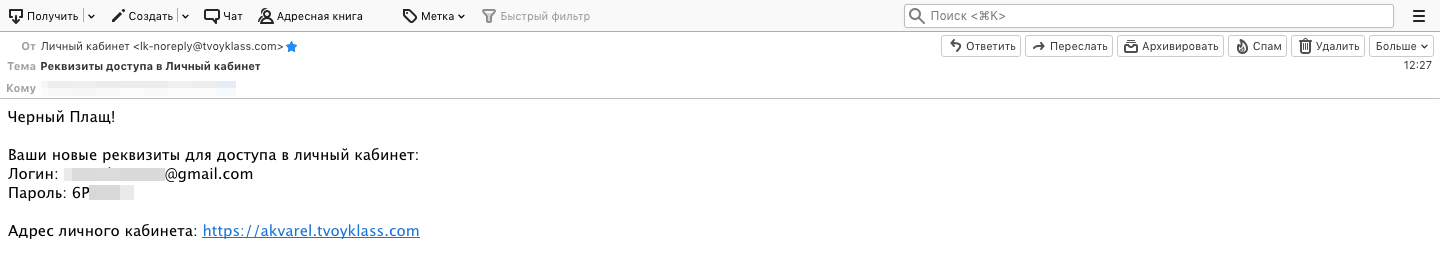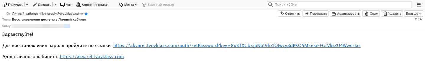 Письмо приходит в течение 15 минут после запроса - с адреса lk-noreply@tvoyklass.com, имя отправителя: "Личный кабинет".