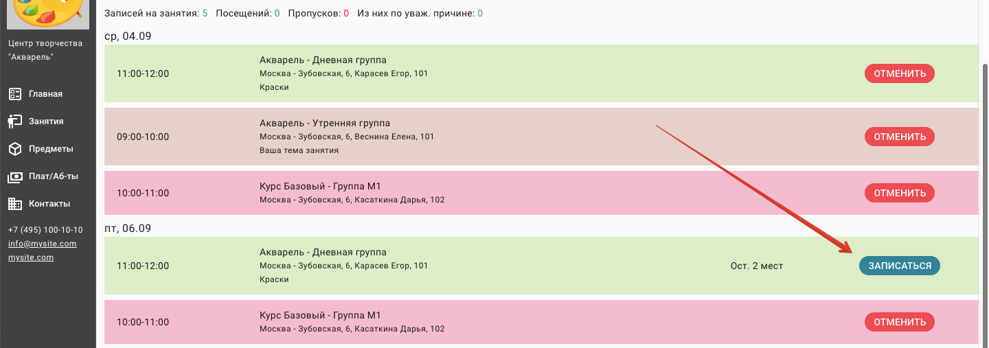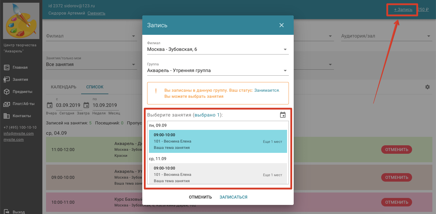 Также вы можете записаться, кликнув на "+ Запись". Выберите филиал и группу/предмет/курс. Вам может быть предложено выбрать занятия, или вы просто запишетесь на курс/предмет без выбора занятий.