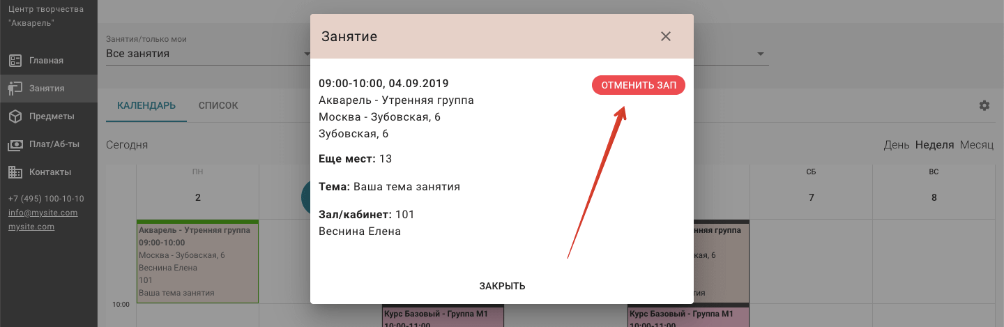 Отменить запись на занятие можно из графика, кликнув на занятие, или из списка занятий.