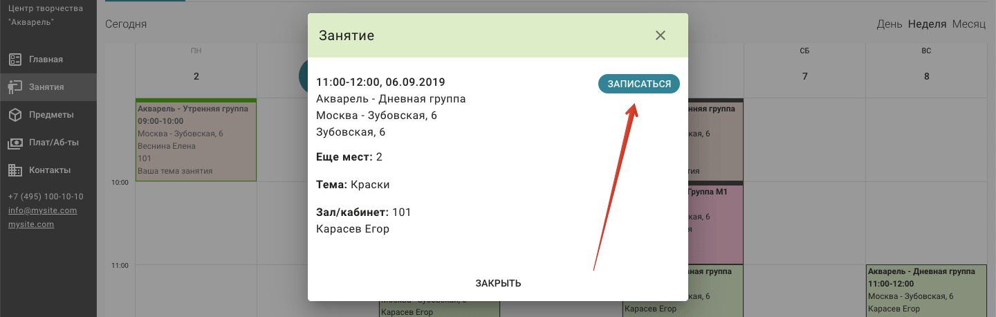 Записаться можно из графика, кликнув на занятие, или из списка занятий.