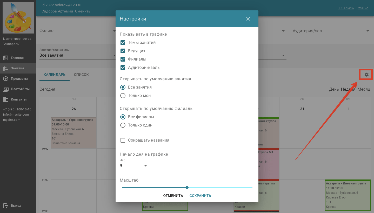 Настроить отображение графика занятий можно, нажав на "шестеренку". Настройте отображение дополнительных данных, масштаб и другие параметры.